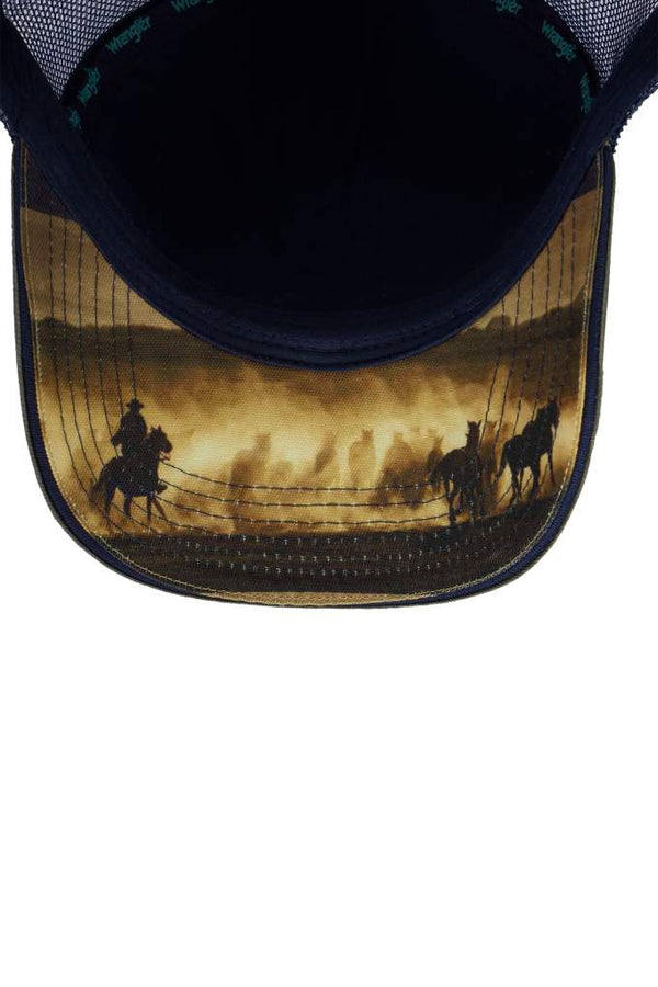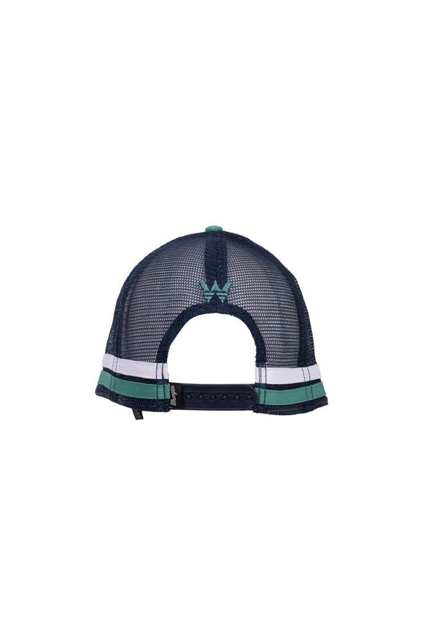 The Wrangler Mens Dwayne High Profile Trucker Cap brings authentic Western heritage to your everyday look. This 5-panel high-profile design features a sage beak, cypress green front, and navy mesh...